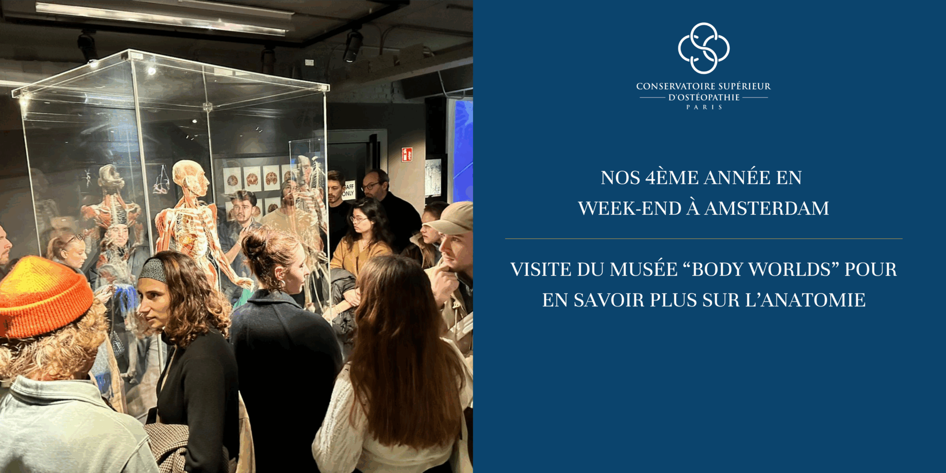 Vie étudiante : Body Worlds, Amsterdam 🕵️ Que se passe-t-il sous notre peau ? C’est la question à laquelle nos étudiants obtiendront une réponse ce week-end à Amsterdam ! Accompagnés de leurs professeurs, ils découvriront l’exposition Body Worlds. Cette exposition qui permet d’approfondir ses connaissance en anatomie, met en scène de vrais corps conservés selon […]